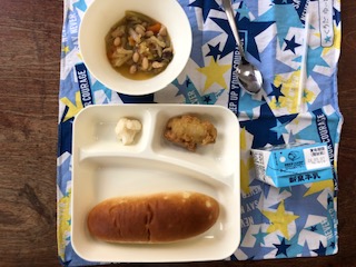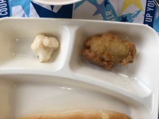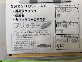 今日の給食には、白身魚のタラを使ったフリッター(揚げ物)が出ました。