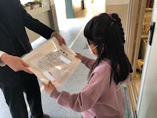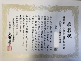 放送朝会で、「伝えよう いのちのつながり作文」に応募して優秀賞を受賞した児童の表彰を行いました。応募した全員に参加賞が用意されています。