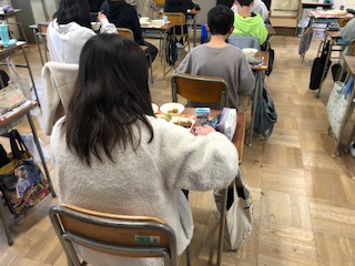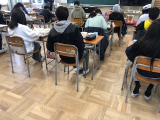 6年生の教室では、配膳の後、卒業祝い献立をおいしく食べています。