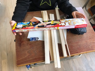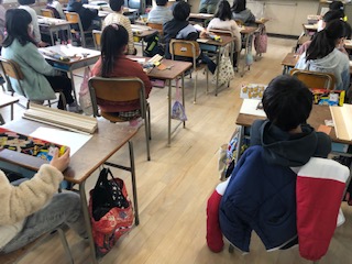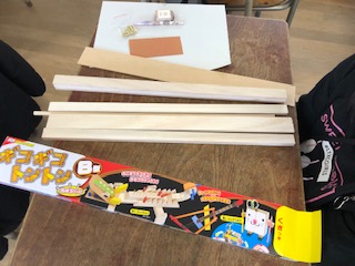 6年生と同じ時間に3年生でも図工をしていました。木工工作の材料を広げています。金づちやのこぎりを使います。