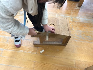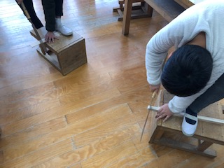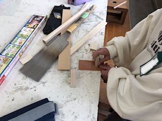 この前の時間には制作に取りかかっていなかった3年生は、今日はのこぎりを使って作り出していました。子どもたちはのこぎりには悪戦苦闘しているようです。サンドペーパーをかけている児童もいました。
