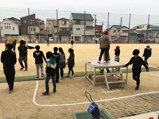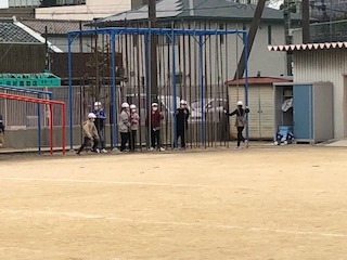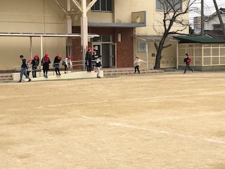 他の学年といっしょに遊ぶ時間を設けていきます。今日は、5年生と巴鬼(ともえおに)をしました。3チームに分かれてそれぞれの陣地を守っています。