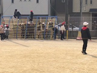 6年生とこの小学校でいっしょに過ごすのもあとわずかです。他の学年とのふれあう時間を設けています。この時間は2年生と遊びました。