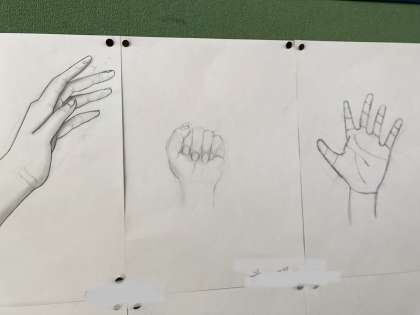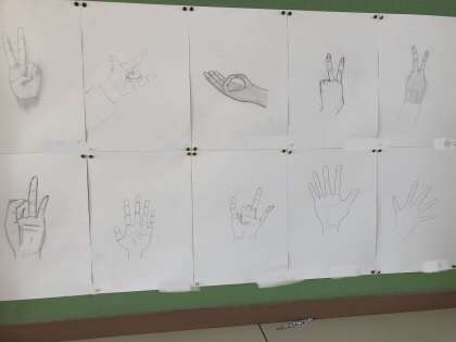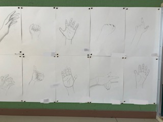 6年生の教室の後ろに、子どもたちが自分の手を描いた絵が貼られています。