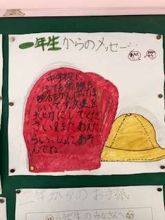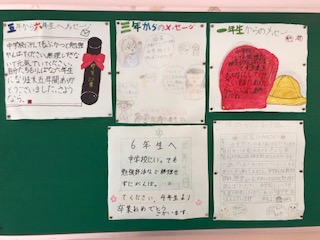 掲示板に各学年から6年生へのメッセージが貼られています。