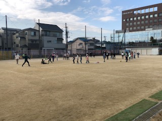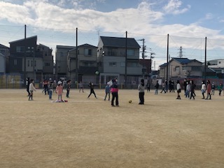 6年生が3年生とドッジボールを楽しんでいます。