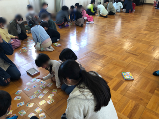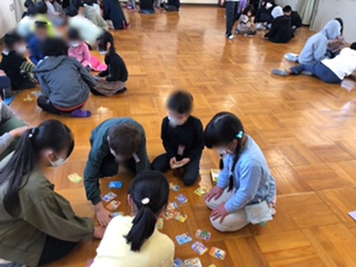 少人数のグループに分かれて仲良く和気あいあいとカルタを楽しんでいます。