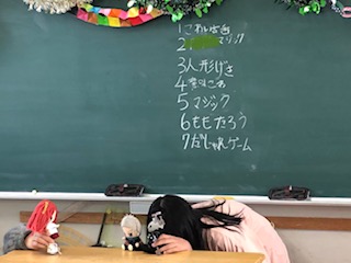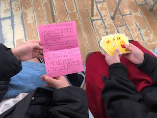 お楽しみの出し物もいろいろと工夫されています。カードマジックの用意をしている子どもたちもいます。