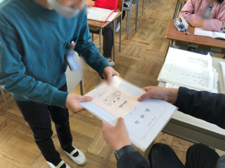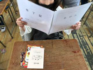 子どもたちは担任からあゆみをもらい、手にしたあゆみをじっくりと見つめています。「見て見て」と校長に見せてくれる子どもたちもいて、「よくがんばったね」と励ましの声をかけました。