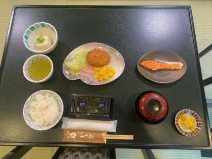 焼き鮭、コロッケ、スクランブルエッグ、ハム、サラダ、冷奴、お漬物、お味噌汁でした。