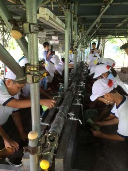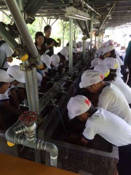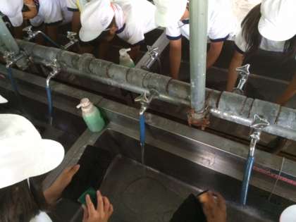 焼き板の洗い作業です。洗って乾かし、明日に磨いてから絵を描いて仕上げます。スポンジが真っ黒。手も真っ黒?です。