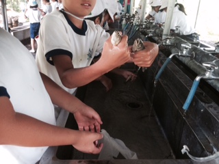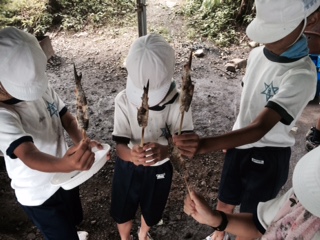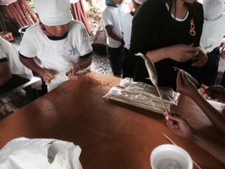 つかんだアマゴを塩でていねいに洗います。そして、竹串でさして、炭火でじっくり焼いてもらって、アマゴの塩焼きの完成!