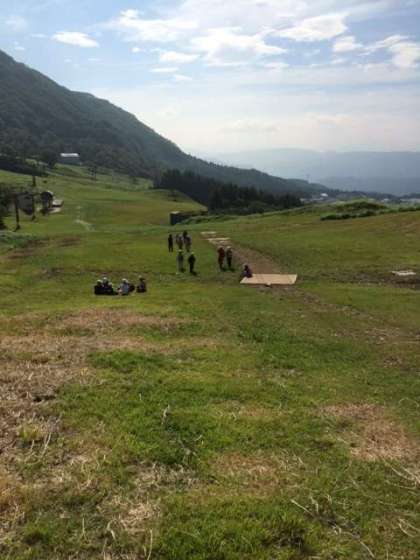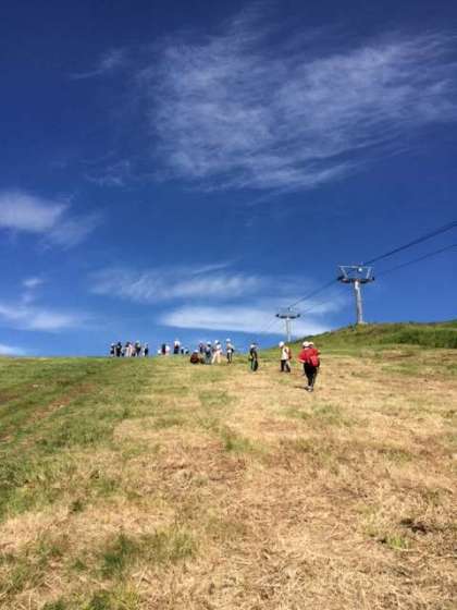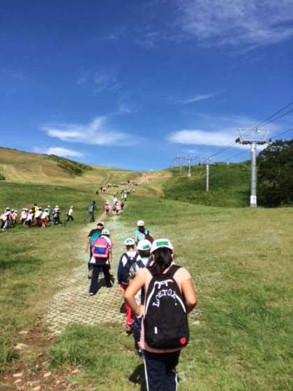 快晴の空のもと、オリエンテーリングに出発しました。班で協力して、励まし合って登ります。各ポイントでカレーの具材のシールをゲットします。