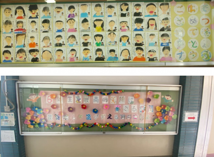 画像上は1年生が描いた6年生の似顔絵とメッセージです。