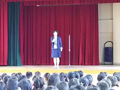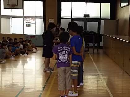 校長先生のお話の後、夏休みの水泳記録会の表彰をしました。