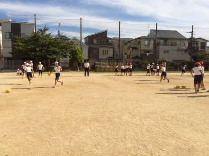 タグラグビーの授業が始まります。元ラガーマンの教頭先生をゲストティーチャーにお迎えし、体ならしのゲームをしています。
