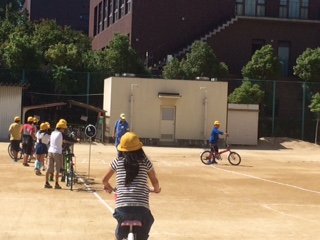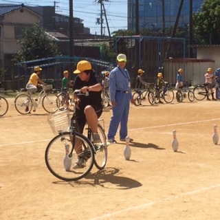 高学年の交通安全指導では、6月に法改正された内容をふまえ、安全な自転車の乗り方の講和と、実際に自転車を乗る実習をしました。