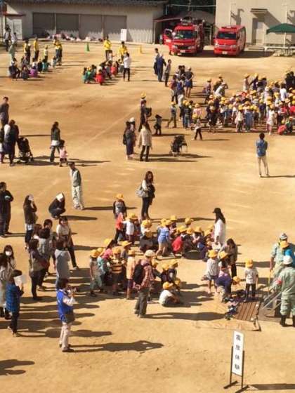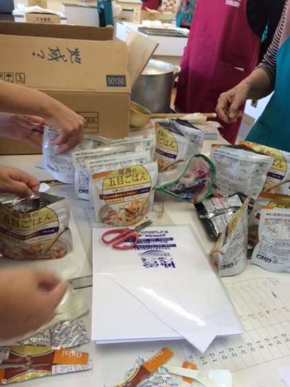 地域の女性会の方々が中心になって、炊き出しもしてもらっています。また、地域の皆さんや中学生が、講堂で防災学習をしています。