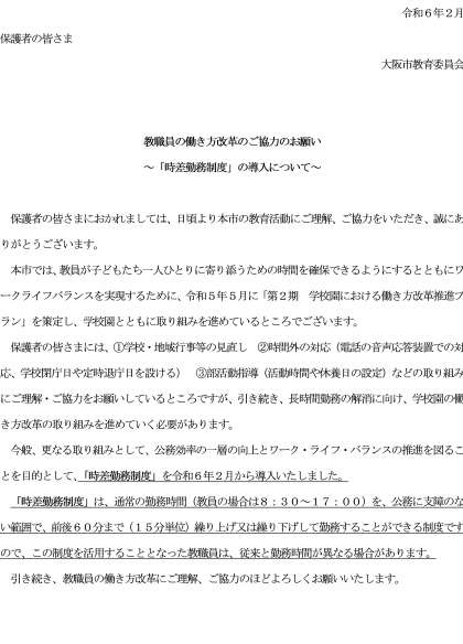 表題の通り、大阪市教育委員会より通知がありましたのでお知らせします。保護者の皆さまには、引き続き教職員の働き方改革にご理解、ご協力のほどよろしくお願いします。
