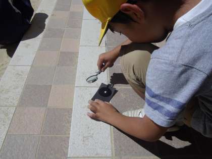 虫眼鏡を使って黒い紙に太陽光を集めました♪
