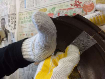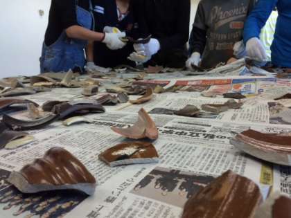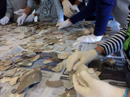 拓本体験の次に、接合体験をしています。ああでもないこうでもないと苦労して繋げています。ぴったり合えば、養生テープで留めます。