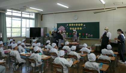 本校では、低学年を中心として配膳のサポートするために、地域のはぐくみボランティアの方が、毎日交代でお手伝いに来てくださっています。