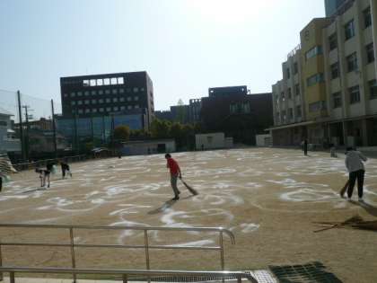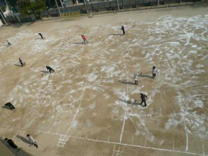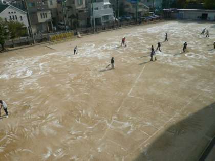 本日18日(金曜日)放課後、教職員全員で、運動場のにがりまき作業をおこないました。