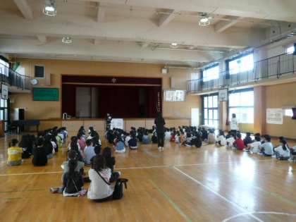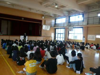 毎週月曜日の朝、全校児童が講堂に集まって、週のはじめの朝会をおこなっています。21日(月曜日)は今年度最初の全校朝会でした。