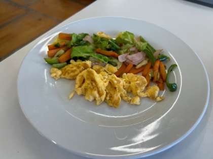 6年生が家庭科の学習で野菜炒めとスクランブルエッグを作りました。