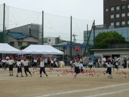 元気いっぱいダンスを踊ってから、かごに向けて玉を投げ入れます!