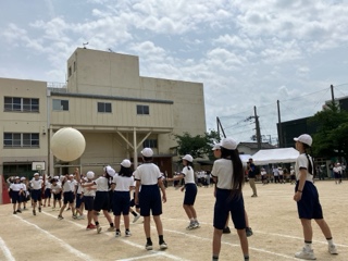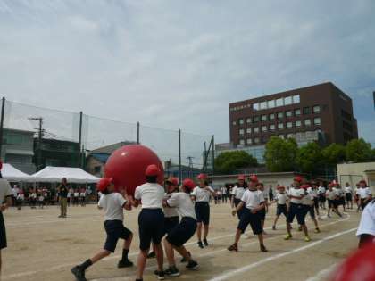 最後の競技は、全学年により「大玉運び」です。運動場半周を、低学年は転がして、高学年は頭の上を、力を合わせて大玉を運んでいきます。2回戦おこないましたが、2回とも大接戦でした。