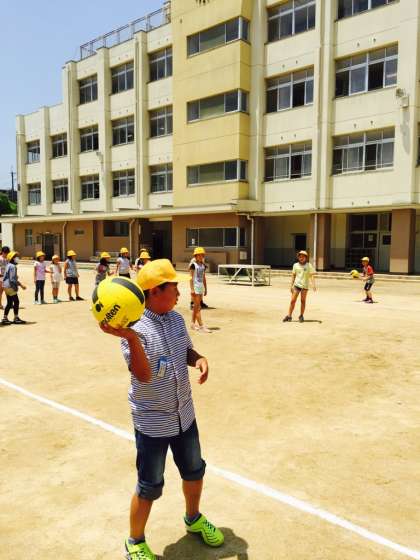 5年生は毎月、学年集会で誕生日を祝っています。インタビューの後、その月の主役がみんなでしたいことを発表します。今日は「ダブルドッジボール」元気な声が響きました。