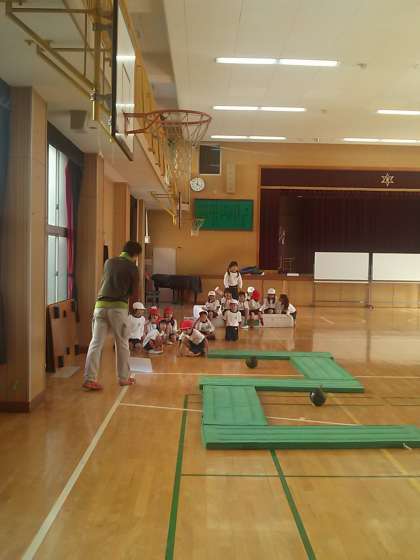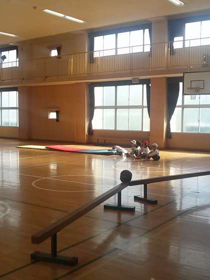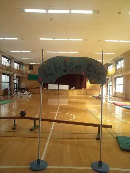 講堂を忍者村にみたてて、1年生が体育のマット運動に取組んでいます。