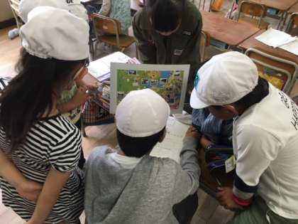 オリエンテーリングに向けてたてわり班で話し合いをしています。