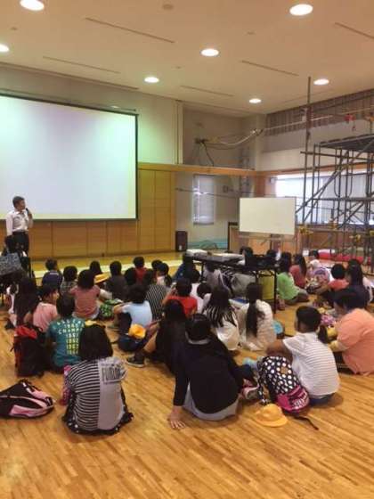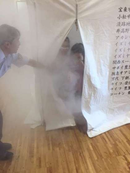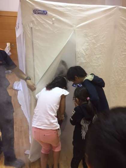 東淀川消防署に来ています。防火についてのビデオを見たあと、煙中体験をしています。