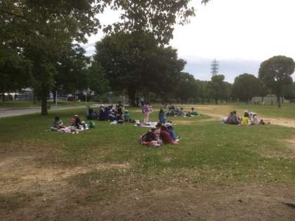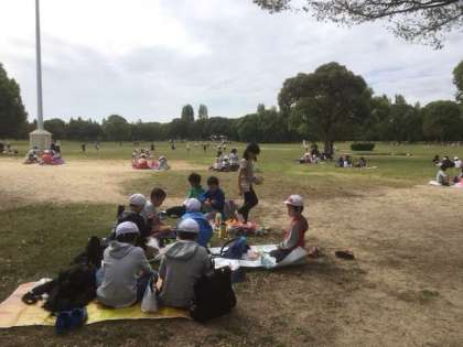 3年生、4年生が広場でお弁当を食べています。今から学年の活動です。