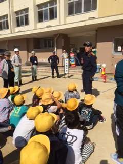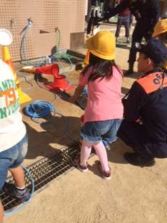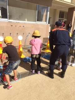 水消火器を使って、消火体験をしています。的に向かって上手にあてています。