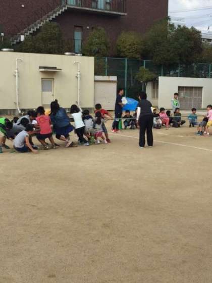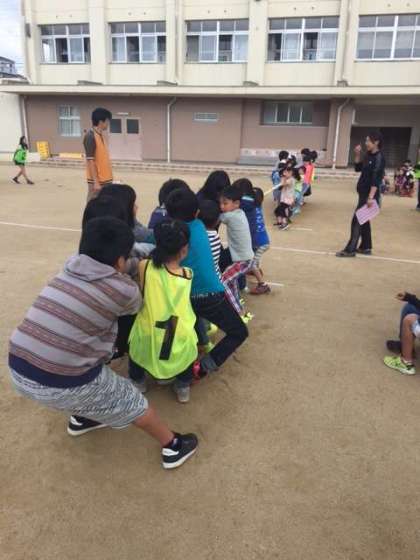土曜日に縦割り班でつな引き大会をします。今日は並び方を決めて、練習しました。力いっぱいひっぱれひっぱれ。