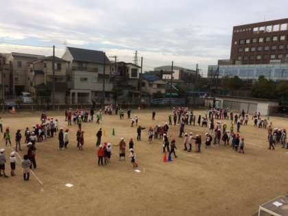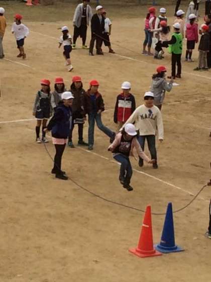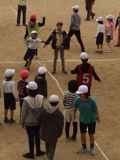 今日の児童集会は、長縄です。たてわり班で8の字跳びをしています。