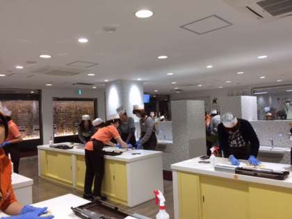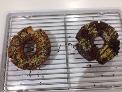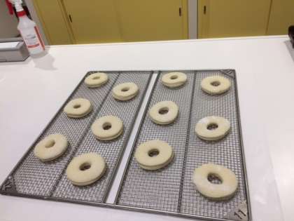 ミスドキッチンに来ています。ドーナツを作っています。生地からくり抜きました。オールドファッショのデコレーションもしました。