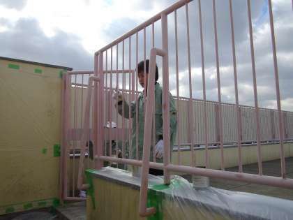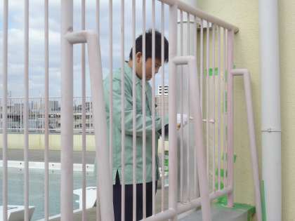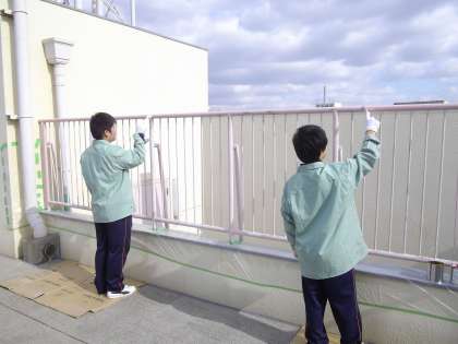 講堂の屋上にあるプールの柵を寒い中頑張って塗っています!