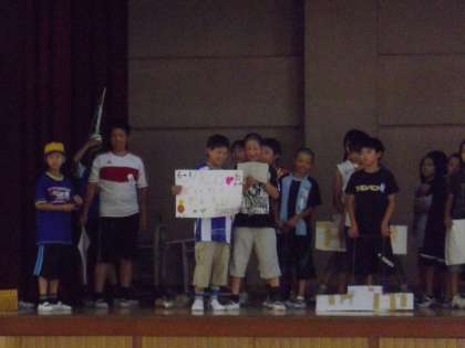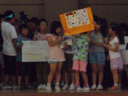 今日の児童集会は講堂でなかよし集会のお店紹介が