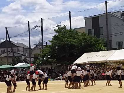 1・2年生の団体演技「好きだー!」、4年生の紅白対抗リレー、6年生の騎馬戦です。