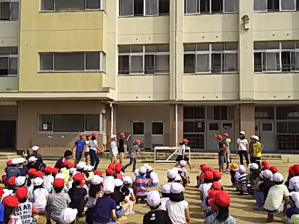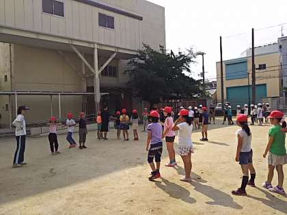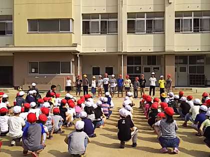 まず、運動委員会の児童が説明し、お手本を示しました。その後、他の児童もクラスの友だちとグループごとに大縄に取り組みました。