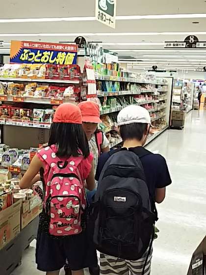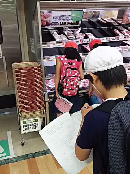 スーパーマーケットを見学しています。お客さんが買い物をしやすくするための工夫や商品の産地、バックヤードの様子を調べてます。