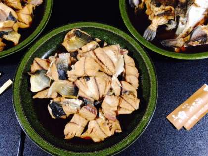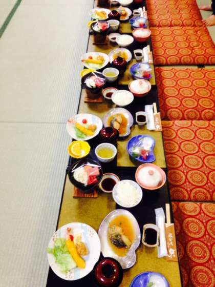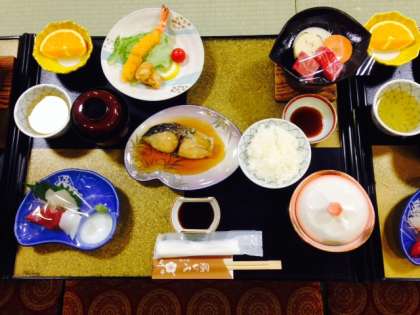 夕食が始まります。献立をごらんください。地引網でとった魚も並べられています。