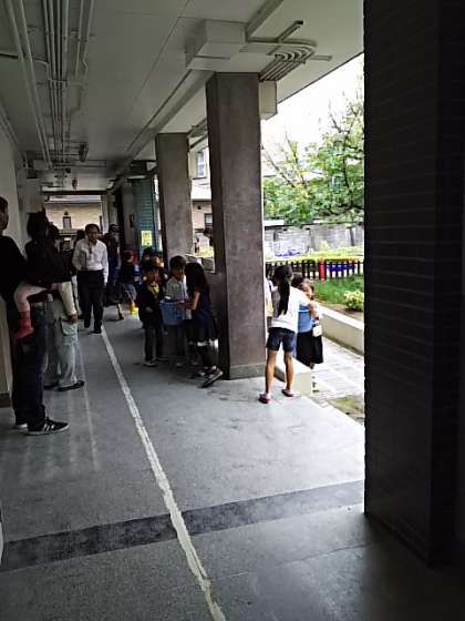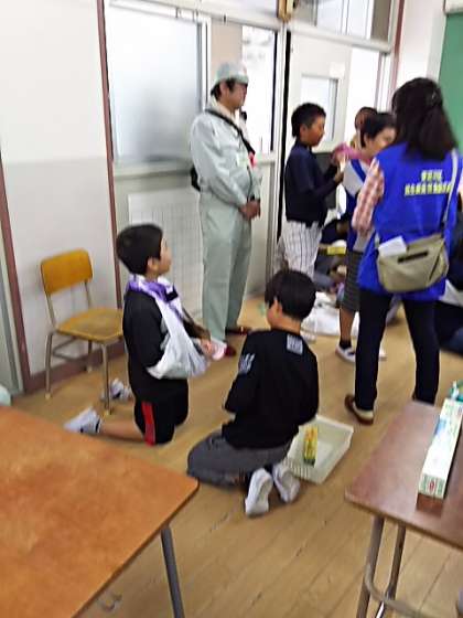 今日は地域合同防災訓練です。セレモニーのあと、消火バケツリレーや応急手当て体験などをしています。