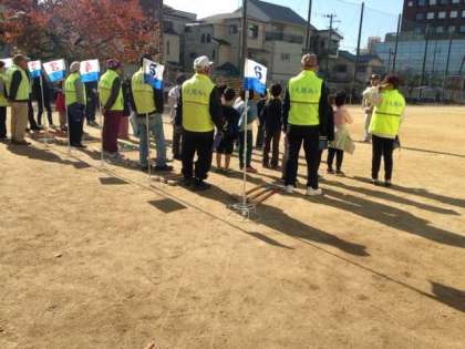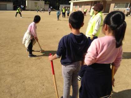 2年生が地域の方に教えていただいてグランドゴルフをしています。