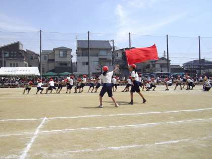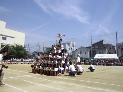 運動会も終盤。綱引きに続き、組体操。心を一つにして全員ピラミッドも完成しました。