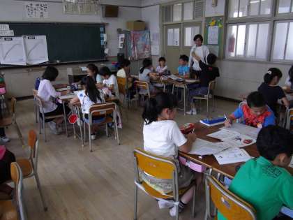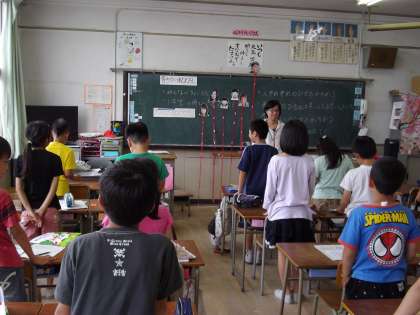本校で2回目の授業をしました。実習生は語りかけるように説明し、子どもたちも活発な発表で授業を盛り上げてくれました。
